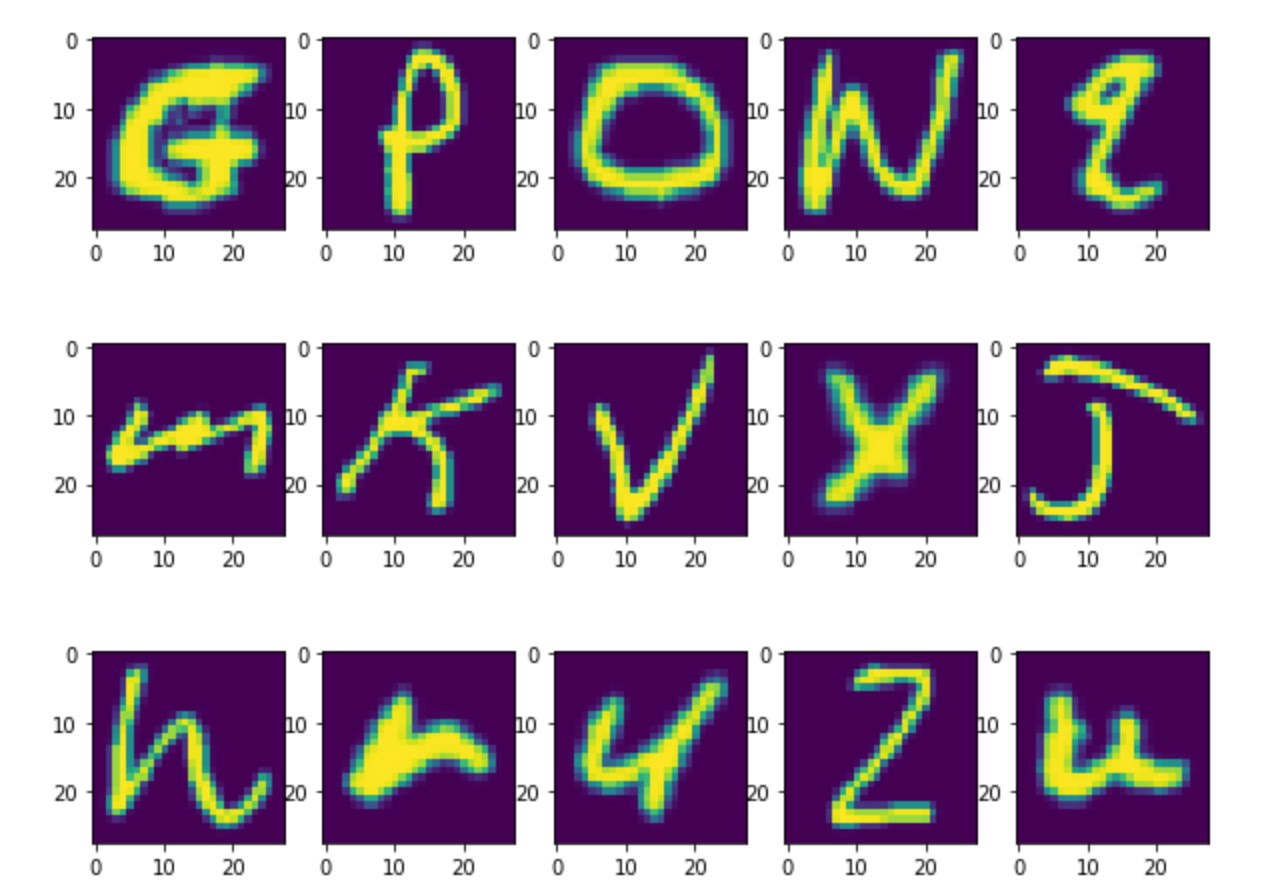 The dataset can be directly loaded from kaggle, another benefit of the site. The images come as preprocessed 28x28 images of both upper and lowercase handwritten characters. Below is a example of a few of the loaded images. Loading the dataset itself was a challenge but an example using the same dataset by _____ was used here.