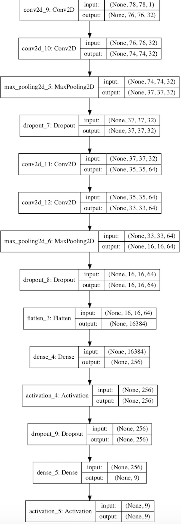 To implement the machine learning algorithm, we first collected a training dataset by taking approximately 1500 images for each bees with each tag number. We also took approximately 1500 images in which there are no bees in the images. Each of those images is processed and has its tag extracted. We also record the tag number corresponding to each image so that we have a training target dataset. 10% of the training data is randomly selected as the validation set. The training labels 0-8 are converted one-hot vectors of length 9. The training samples and training labels are then forwarded to the convolution neural network. The overall structure of the network is shown below. The "None" parameter represents the number of images input.