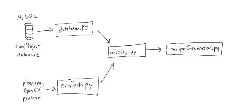 Once all other code was tested, we created a main program, “recipeSelector.py” which progresses through the display sequences. Once we had tested the entire program, taking a picture of a barcode, displaying its corresponding ingredient, and then opening the associated recipe, we added functionality for scanning multiple ingredients before generating a recipe. This required significant debugging, as well as an additional display mode “waitForButton” which provided the user time to press a button to stop taking photos and start recipe generation.